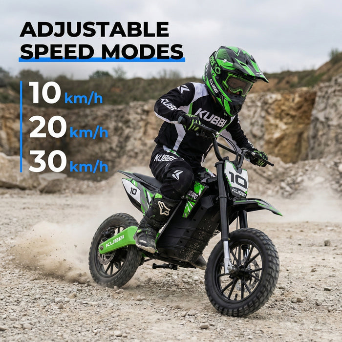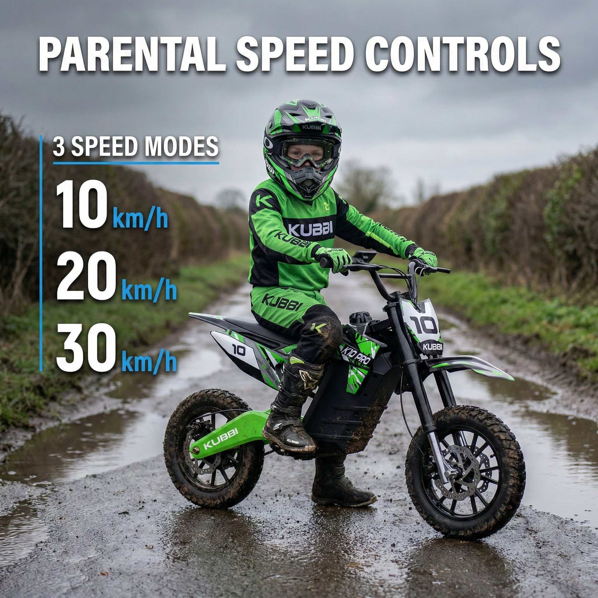 The Kubbi K10 Pro offers three speed settings: 10 km/h, 20 km/h, and a top speed of 30 km/h to suit different skill levels.