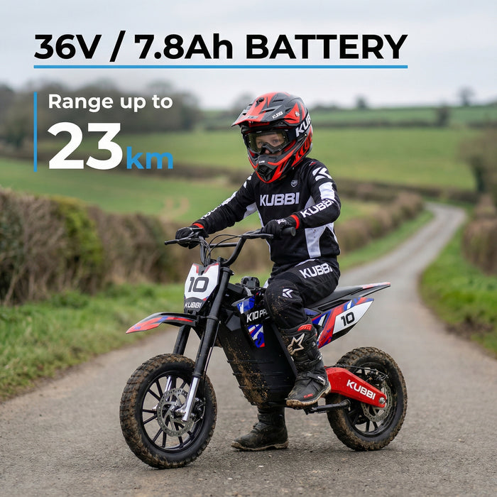 The Kubbi K10 Pro packs a powerful 800W motor, advanced dual suspension, and large 14” off-road tires to deliver a smooth, stable ride on tough terrain. With three speed settings up to 30 km/h and support for riders up to 90 kg, it’s built for bigger kids seeking serious adventure and comfort. Recommended for children aged 8–14 years with a height between 120–170 cm. The seat height (from ground) of 72 cm gives confident riders good balance while maintaining agility. The bike length of 137 cm, handlebar height of 87 cm, and handlebar width of 72 cm ensure a comfortable riding position for growing riders.