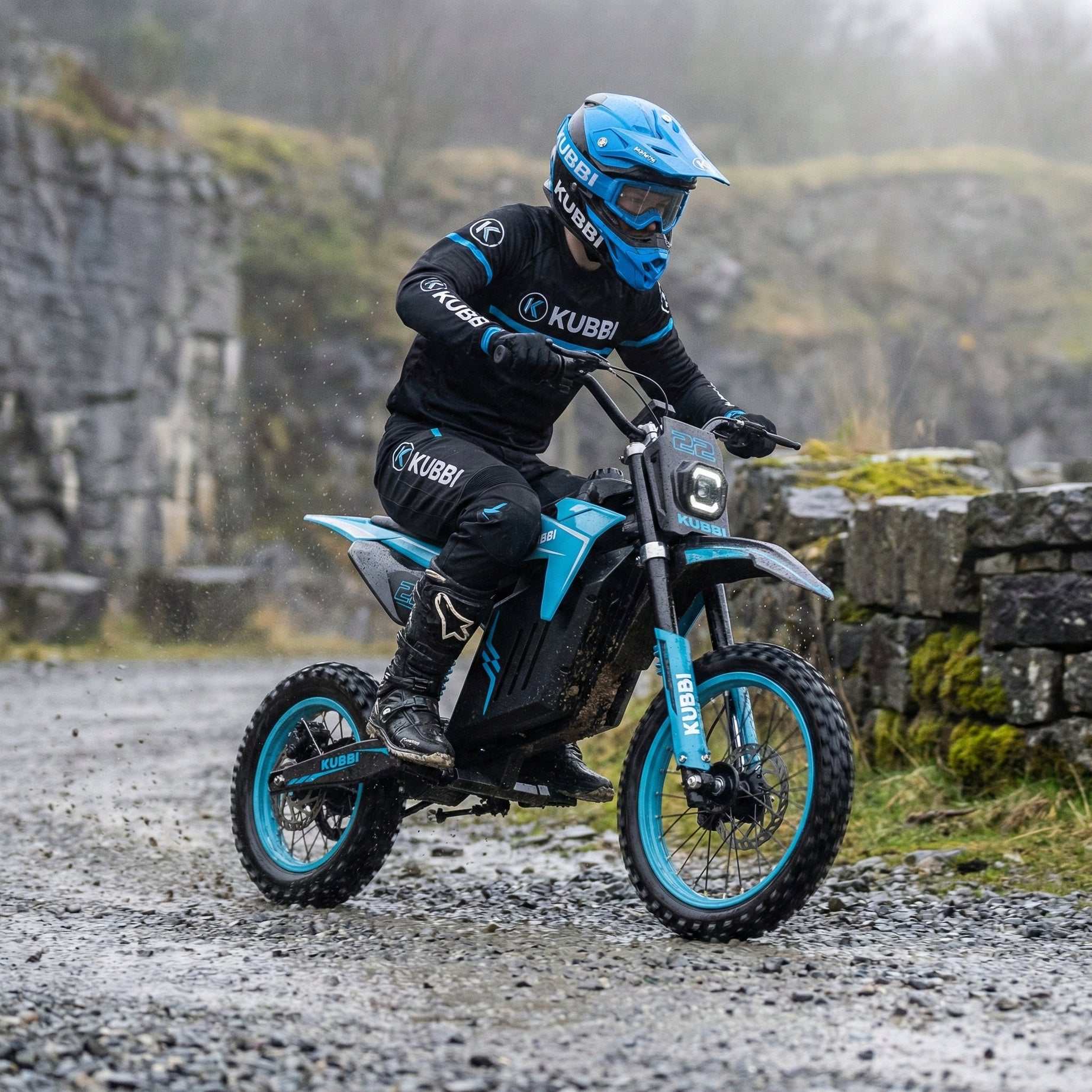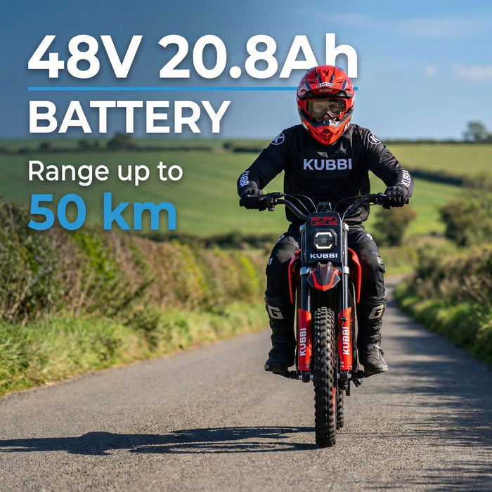 The Kubbi K22 is built for teenagers aged 14+ and delivers strong off-road performance with its 2000W motor (3000W peak). It reaches speeds up to 55 km/h and includes three selectable speed modes — 25 km/h, 35 km/h and 55 km/h — allowing parents to control how fast their child can ride. The 48V 20.8Ah battery provides a range of up to 50 km with a charging time of around 5 hours. The bike supports riders up to 120 kg and features durable off-road tyres for stability on dirt, gravel and grass. With a 41 kg frame, 30° climb capability and IPX4 water resistance, the K22 is designed for teen riders who need power, control and reliability.