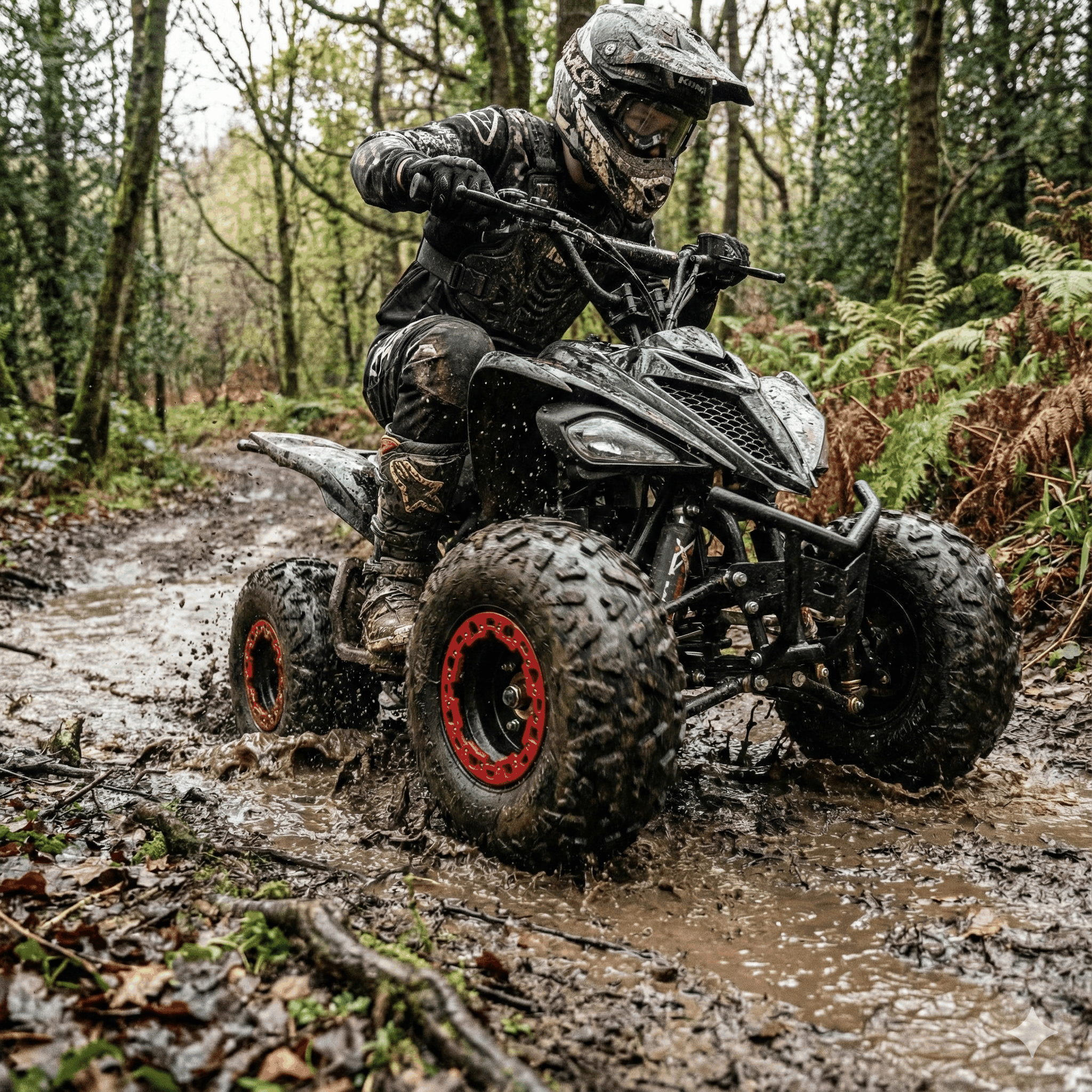 The Kubbi Q32 is built for teens aged 14–18, delivering strong performance with a 2500W 60V brushless shaft-drive motor and a 60V 20Ah battery, reaching speeds up to 43 km/h. It includes hydraulic front and rear shocks, hydraulic disc brakes, a 950 mm wheelbase, 710 mm seat height, 160 mm ground clearance, and an LED headlight. This is genuinely one of the best quads in the UK for this age range and price. If you have a teenager looking for a reliable, safe, and powerful quad, this is the one for you.
